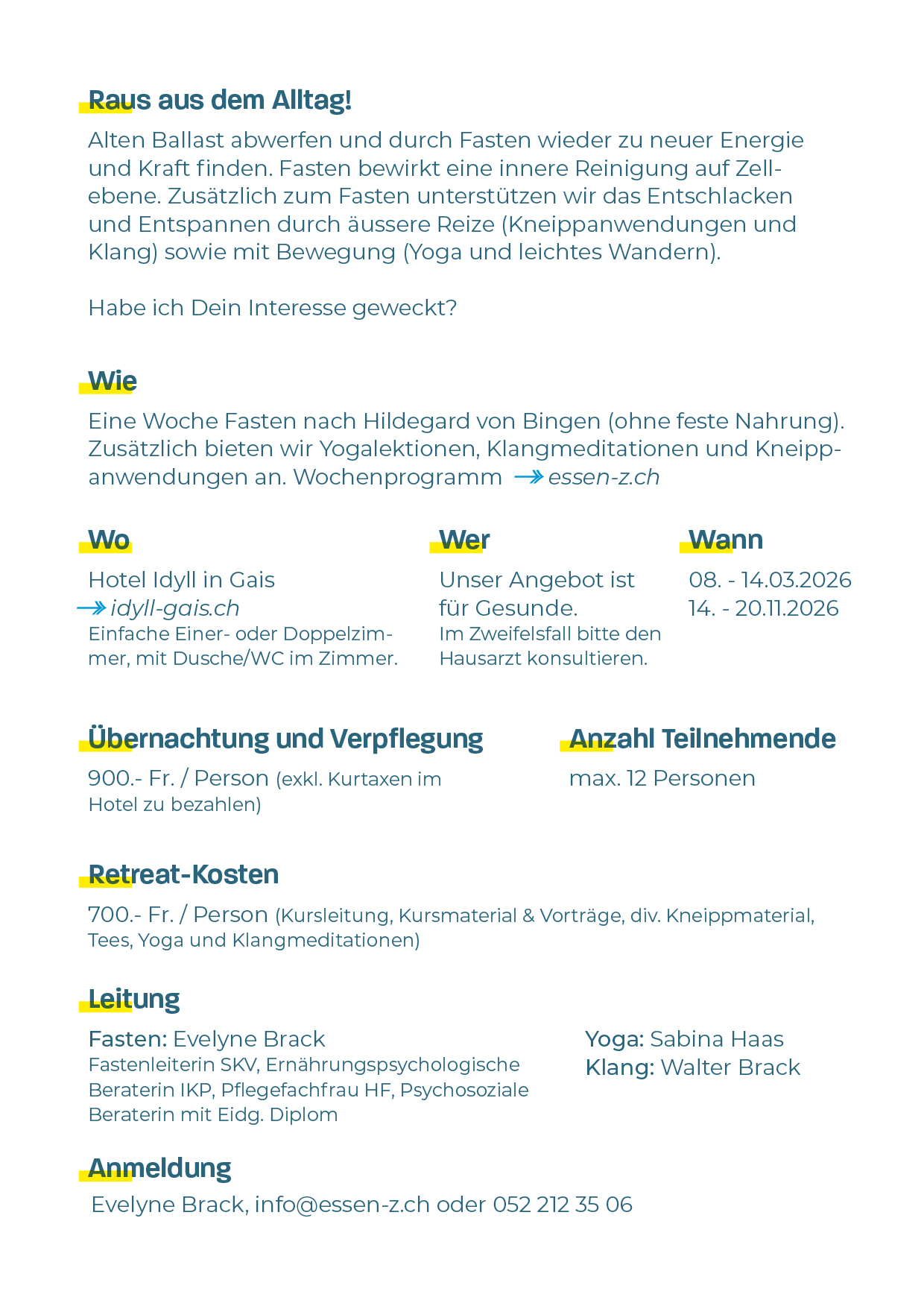 Der Fastenkurs wurde sehr kompetent und mit Freude geleitet. Das Yoga und die Entspannungsübungen waren super! Die Verpflegung war vielseitig im Geschmack, immer frisch zubereitet, gemüsig/fruchtig! Die Aktivitäten rund ums Fasten waren toll! Sehr abwechslungsreich, lehrreich und interessant. Nach der Fastenwoche habe ich weniger Beschwerden, schlafe besser und die Verdauung hat sich ebenfalls verbessert bei mir. Mein Mann und ich essen jetzt bewusster und langsamer im Alltag. Mein neues Credo: «In der Ruhe liegt die Kraft!»